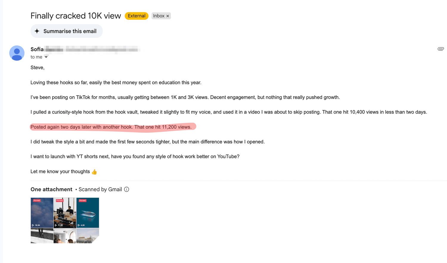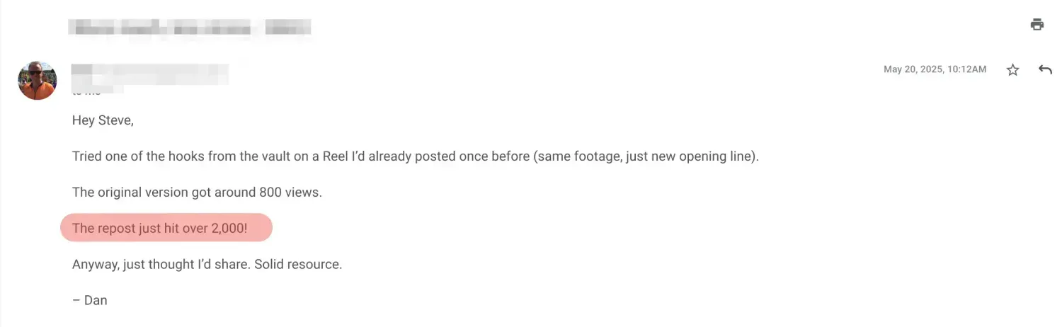 2,000+ real hooks from videos that blew up to drop straight into your content so you can stop guessing and start growing.